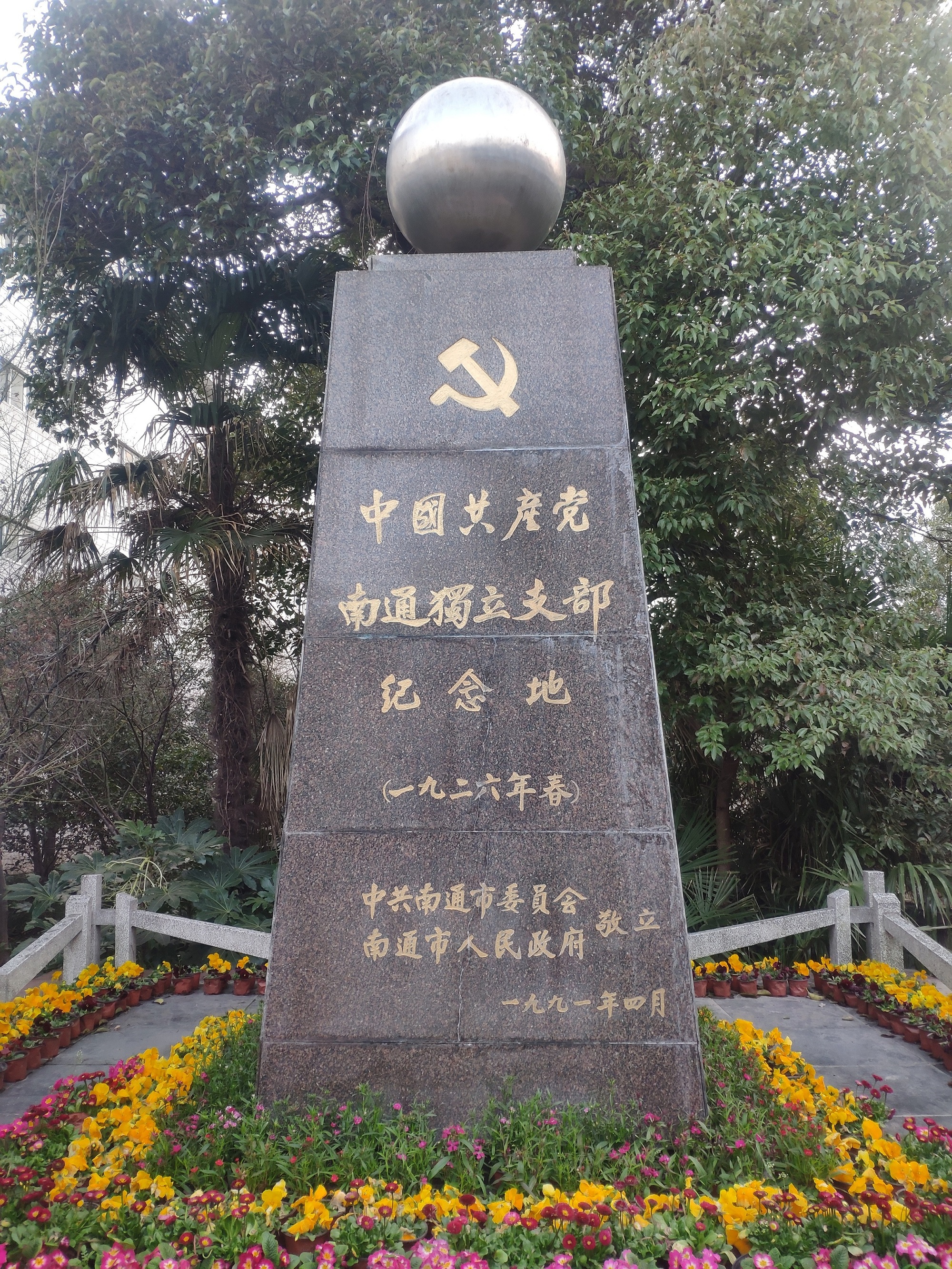 为纪念中共南通独立支部的诞生,南通市委、市政府于1991年4月,在南通国棉一厂敬立“中共南通独立支部纪念地”碑。整个碑造型象一座灯塔,象征南通有了最早的党组织,党的光辉照江海。碑上端用一个不锈钢球,象征着共产党员具有解放全人类的崇高理想,象征着团结奋斗,同时,又象征着通棉一厂上下团结为社会主义建设奋力拚搏。白色拦杆用腾飞的海燕造型,象征党的事业和通棉一厂的发展具有无限的生命力,为纪念碑增加了动感。碑基高70公分,寓意立碑之年为中国共产党建党70周年。碑高4.2米,象征当年是南通解放42周年。球直径为65公分,象征当年是南通独立支部建立65周年。白色栏杆高0.6米、台阶6级,寓意独立支部建立时6名党员。