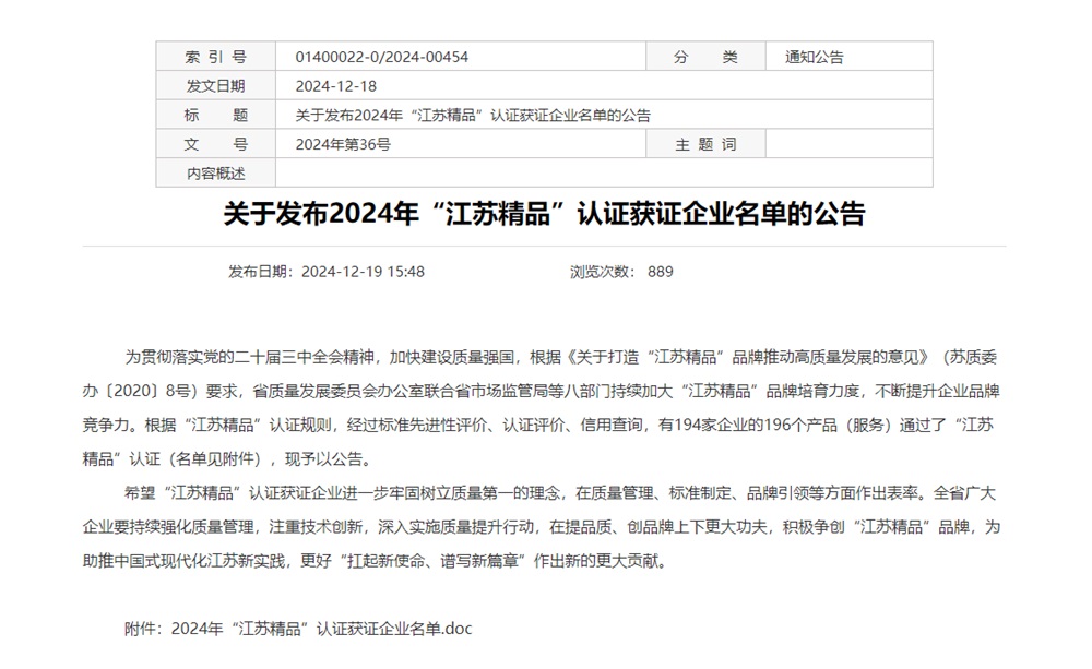 永利yl23411成功入选2024年“江苏精品”认证获证企业名单